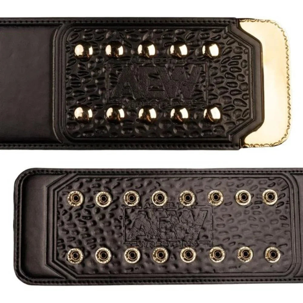 The center plate features a bold AEW Tag Team layout framed by refined engraving and layered contours, symbolizing teamwork at the highest level. Matching side plates enhance balance and visual depth, while the structured design delivers a commanding presence suitable for display or personalization. Finished on a premium leather strap, the belt presents a clean, authoritative championship look.